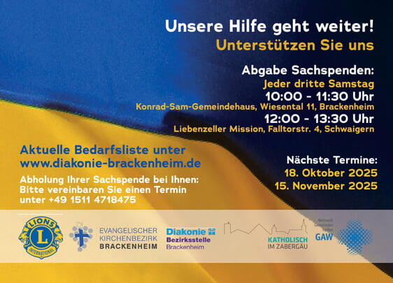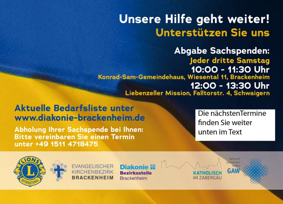 Wiederum eine große Unterstützung durch die Bevölkerung erfuhren die Kooperationspartner mit Evangelischem Kirchenbezirk, Katholischer Gemeinde, Diakonischer Bezirksstelle, Gustav Adolf Werk sowie dem Lions Club Güglingen/Zabergäu bei ihrer monatlichen Sammlung der Hilfsgüter für die Menschen in der Ukraine.
